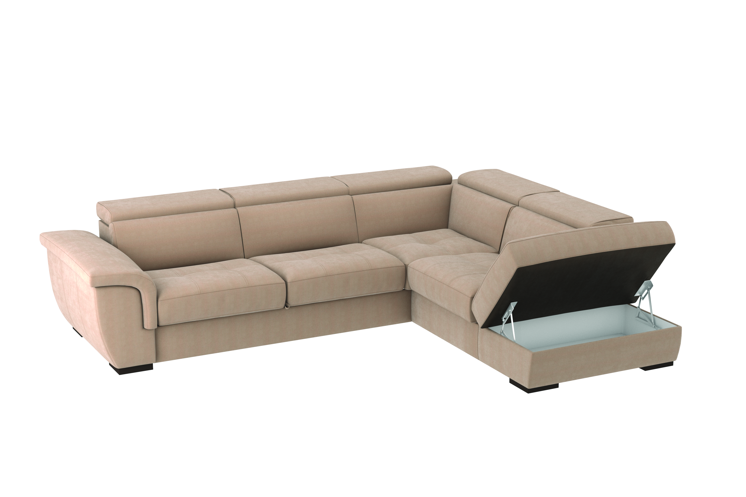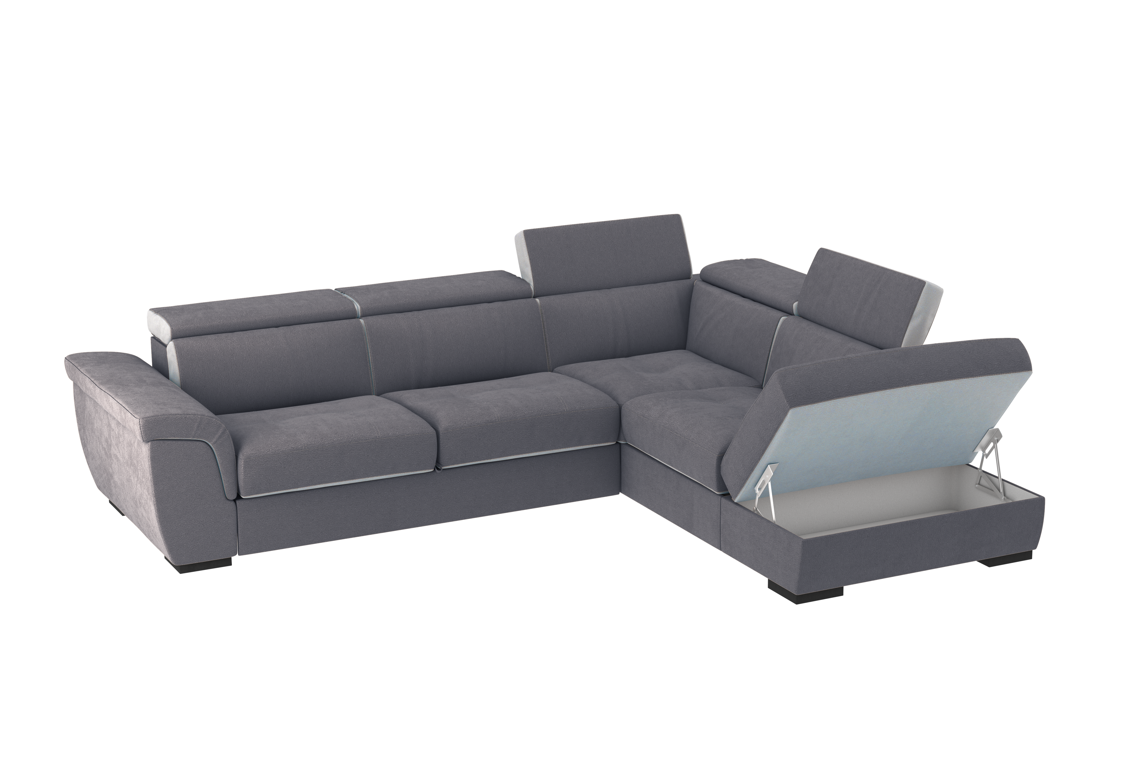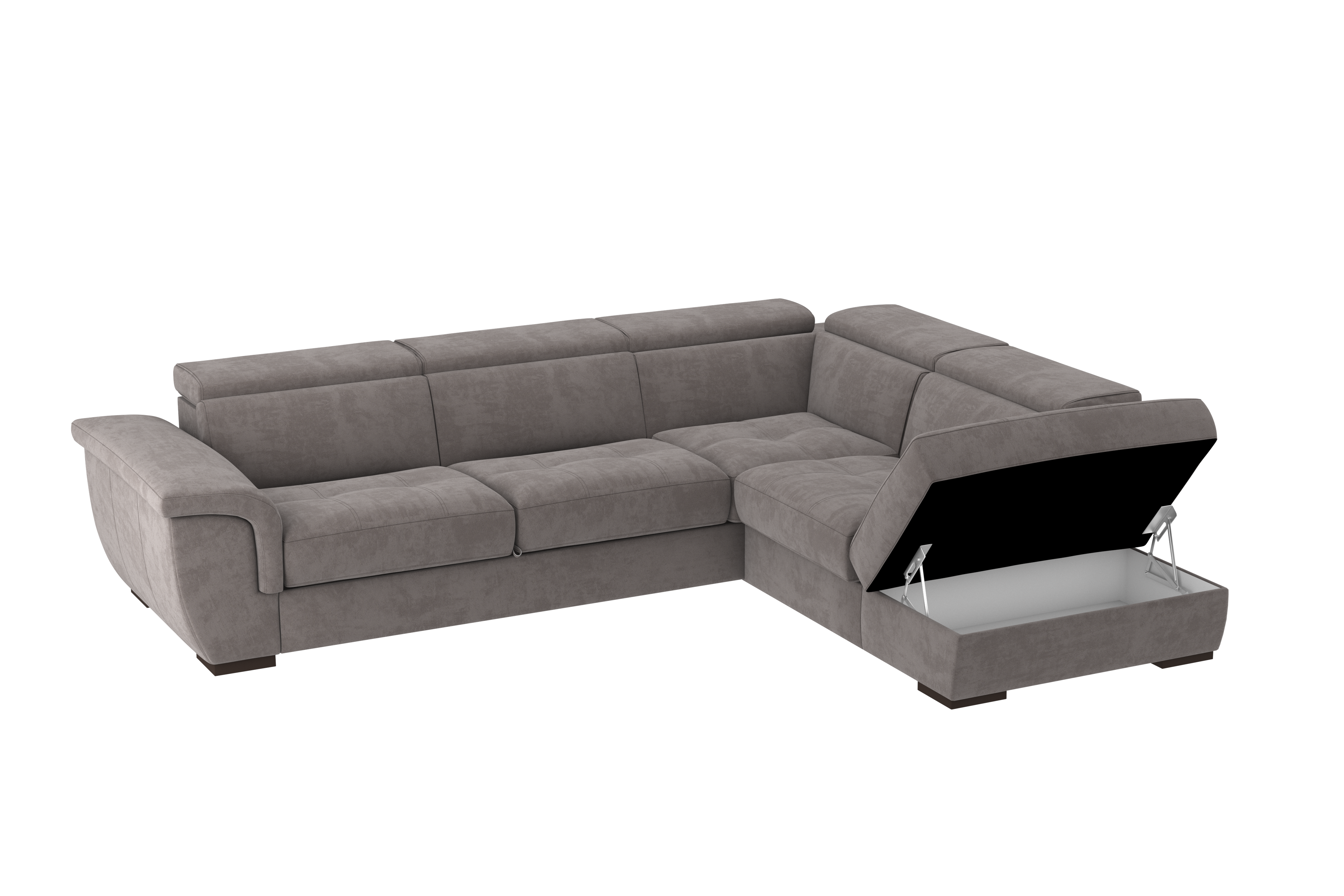 Un divano angolare dallo stile moderno, con un meccanismo inferiore scorrevole che consente di estrarre un ripiano che allineandosi alla seduta crea un comodo letto o un semplice supporto poggiapiedi. Il pouf terminale è un capiente contenitore dove riporre cuscini e quant’altro. Il divano è prodotto con tessuto di alta qualità resistente all’abrasione. Interamente prodotto in UE.