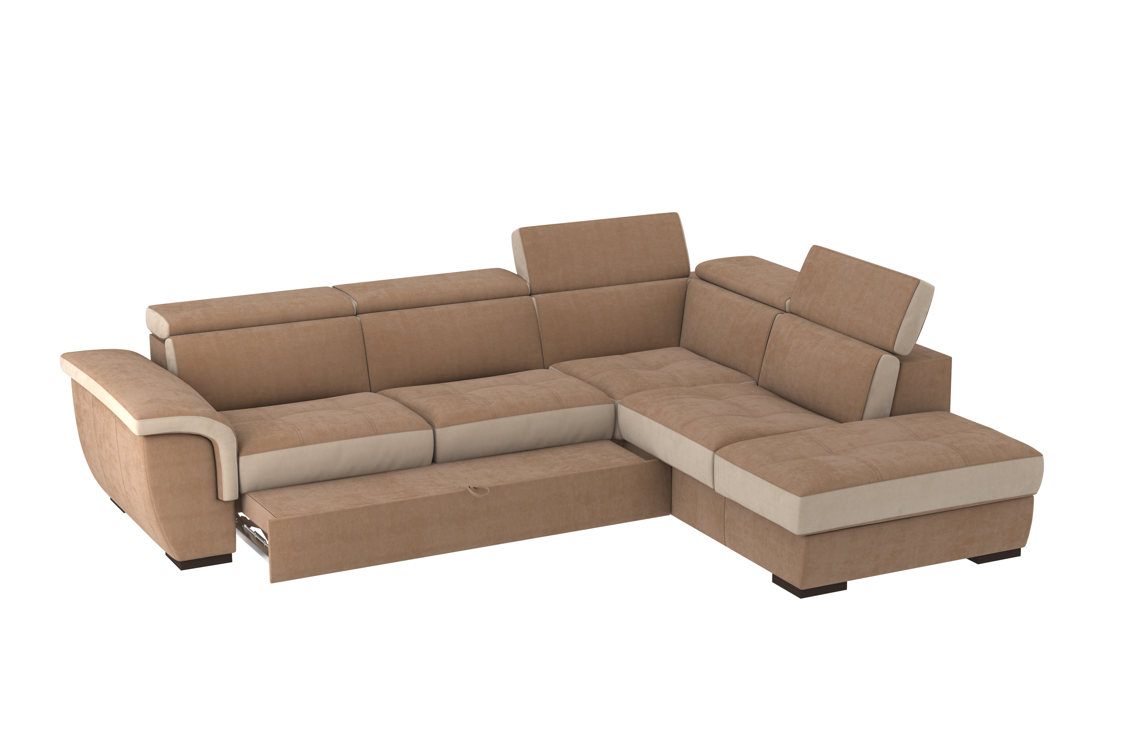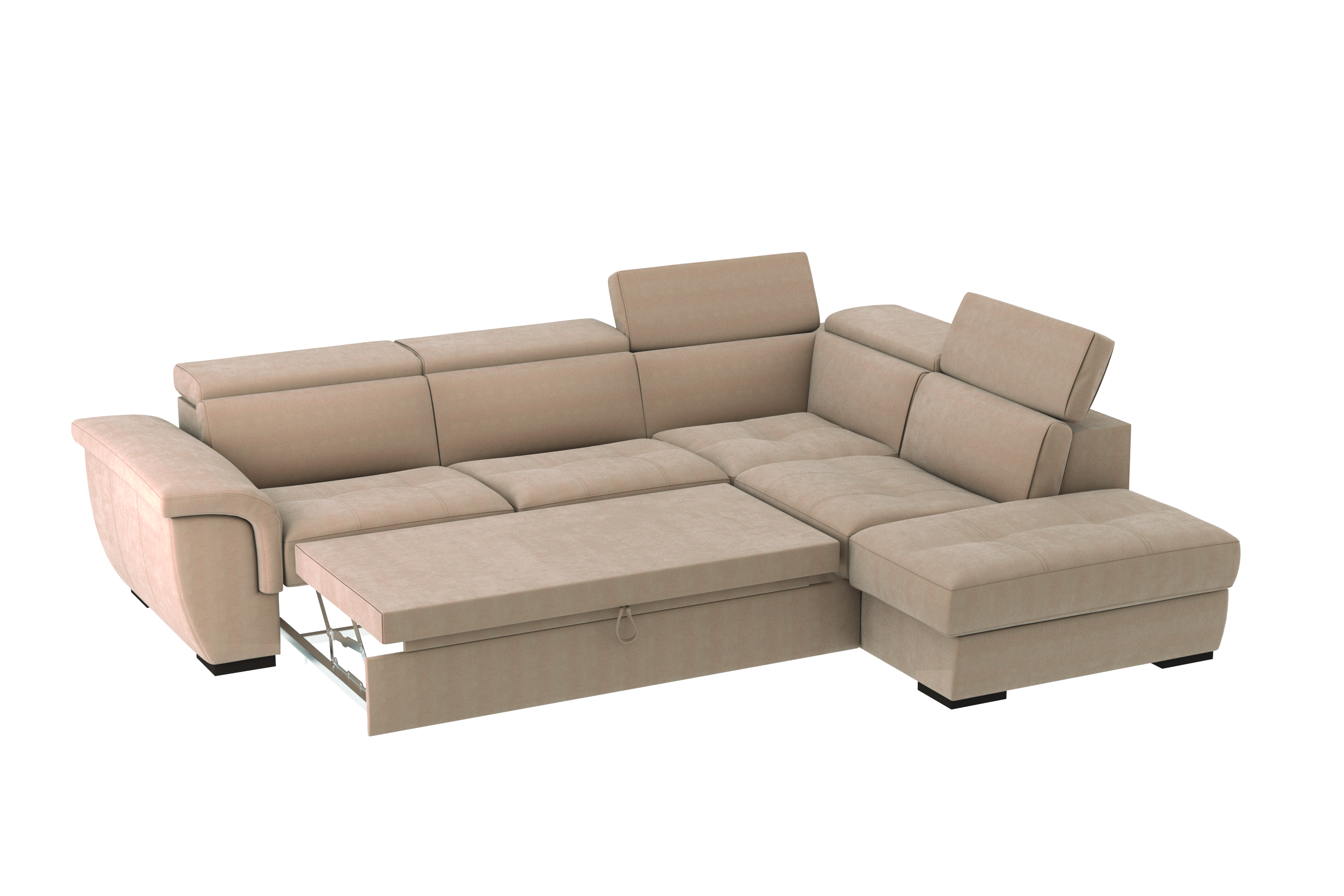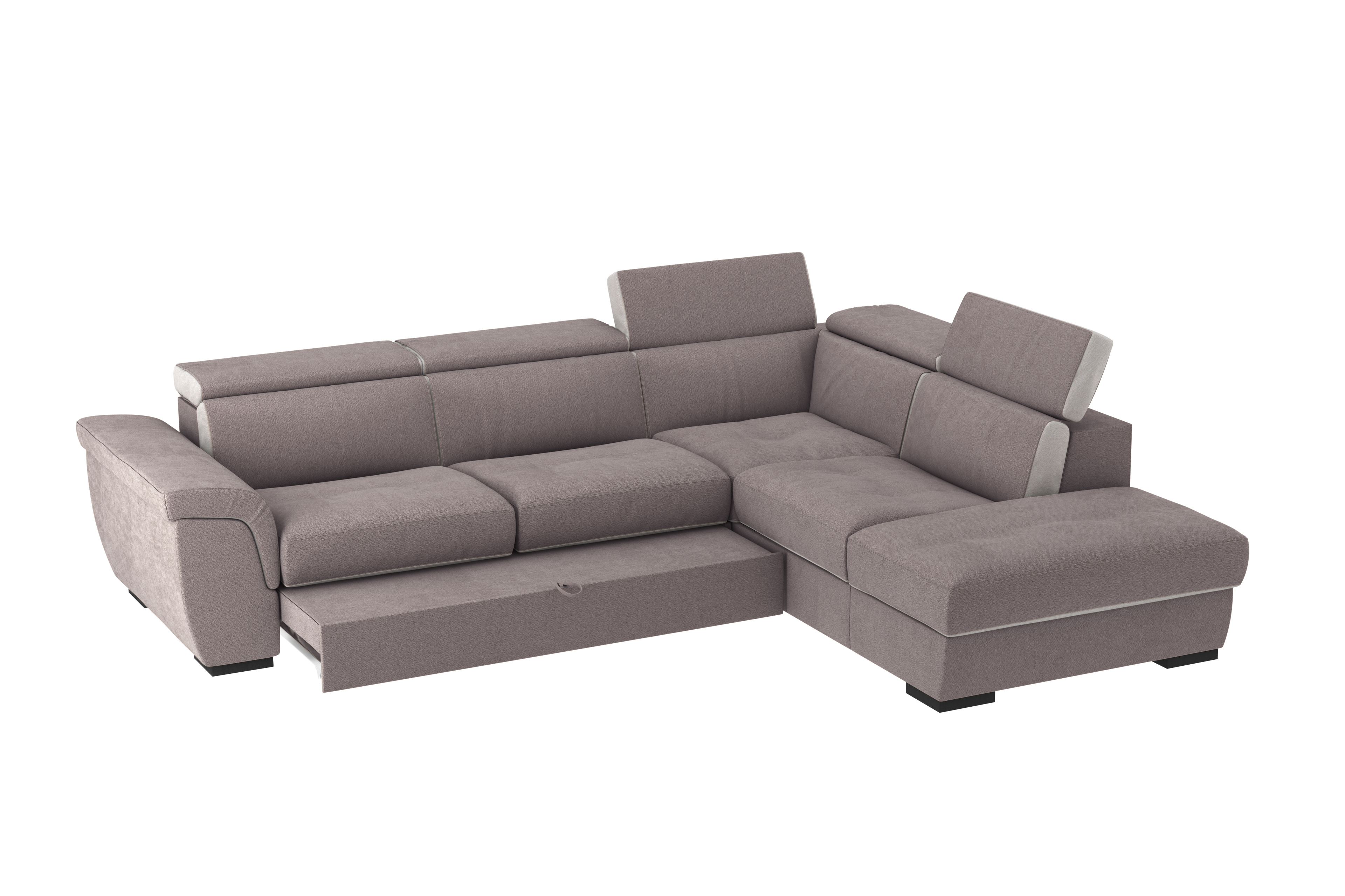 Un divano angolare dallo stile moderno, con un meccanismo inferiore scorrevole che consente di estrarre un ripiano che allineandosi alla seduta crea un comodo letto o un semplice supporto poggiapiedi. Il pouf terminale è un capiente contenitore dove riporre cuscini e quant’altro. Il divano è prodotto con tessuto di alta qualità resistente all’abrasione. Interamente prodotto in UE.