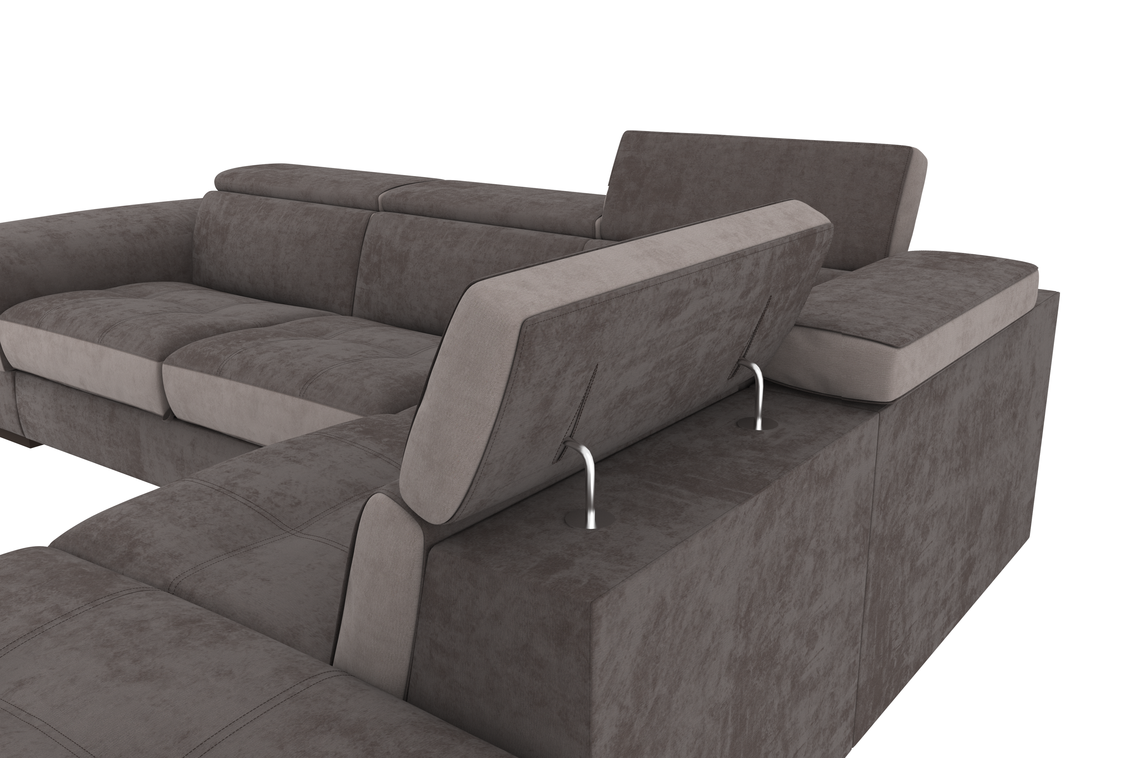 Le ampie sedute sono molto confortevoli e utilizzando il carrello estraibile ci si può comodamente distendere per guardare la tv, leggere un libro o riposarsi. La particolare forma del bracciolo, rende questo divano ancora più versatile utilizzandolo oltre che come poggia braccia anche come guanciale ottenendo così un’ ulteriore postazione per stendersi. Estraendo il carrello, che sollevandosi si allinea alle sedute, si crea un piano riposo assimilabile ad un letto. Il pouf terminale ha un capiente vano contenitore per riporre biancheria, cuscini e molto altro. Questo divano e’ realizzato in tessuto con effetto scamosciato resistente alle abrasioni e garantisce il minimo assorbimento dei liquidi (idrorepellente).