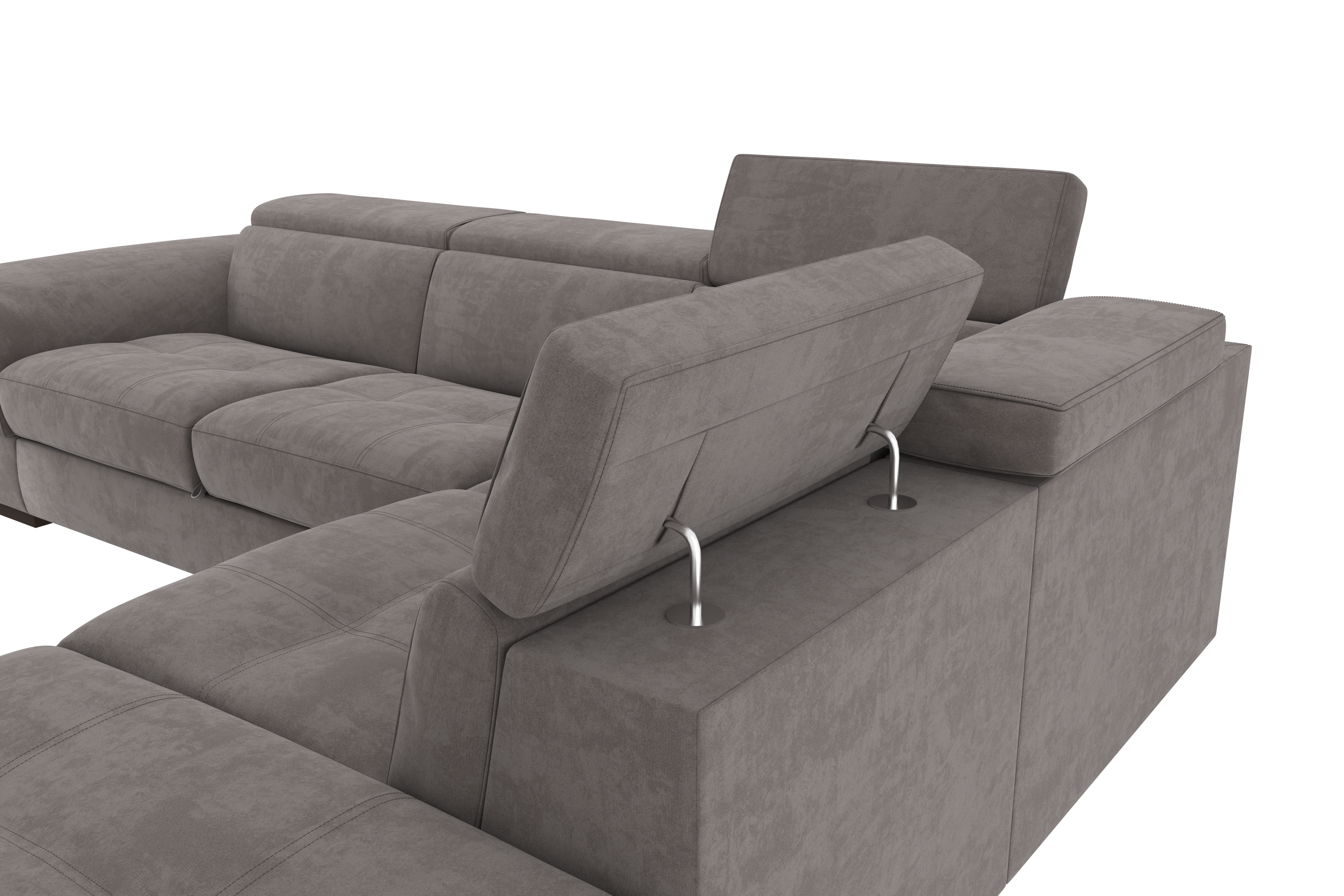 Il Divano angolare 5 posti reversibile, offre il massimo confort grazie ai soffici poggiareni integrati alla struttura, ai poggiatesta reclinabili ed alla seduta, realizzati in poliuretano espanso di alta qualità trapuntata con cuciture in tinta. Il cuscino in appoggio al bracciolo gli conferisce una estetica versatile che gli consente di essere collocato in qualsiasi ambiente sia classico che moderno.