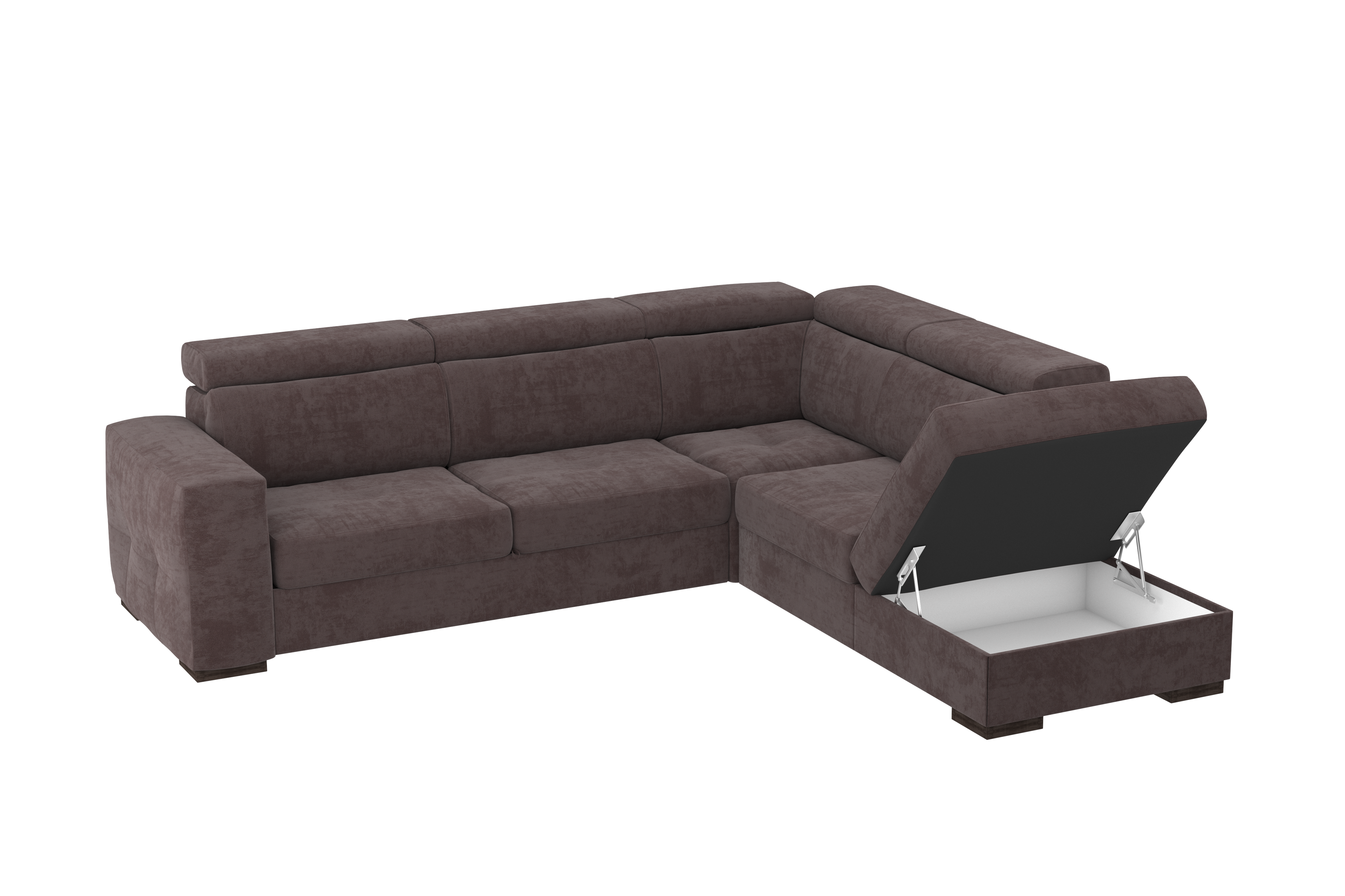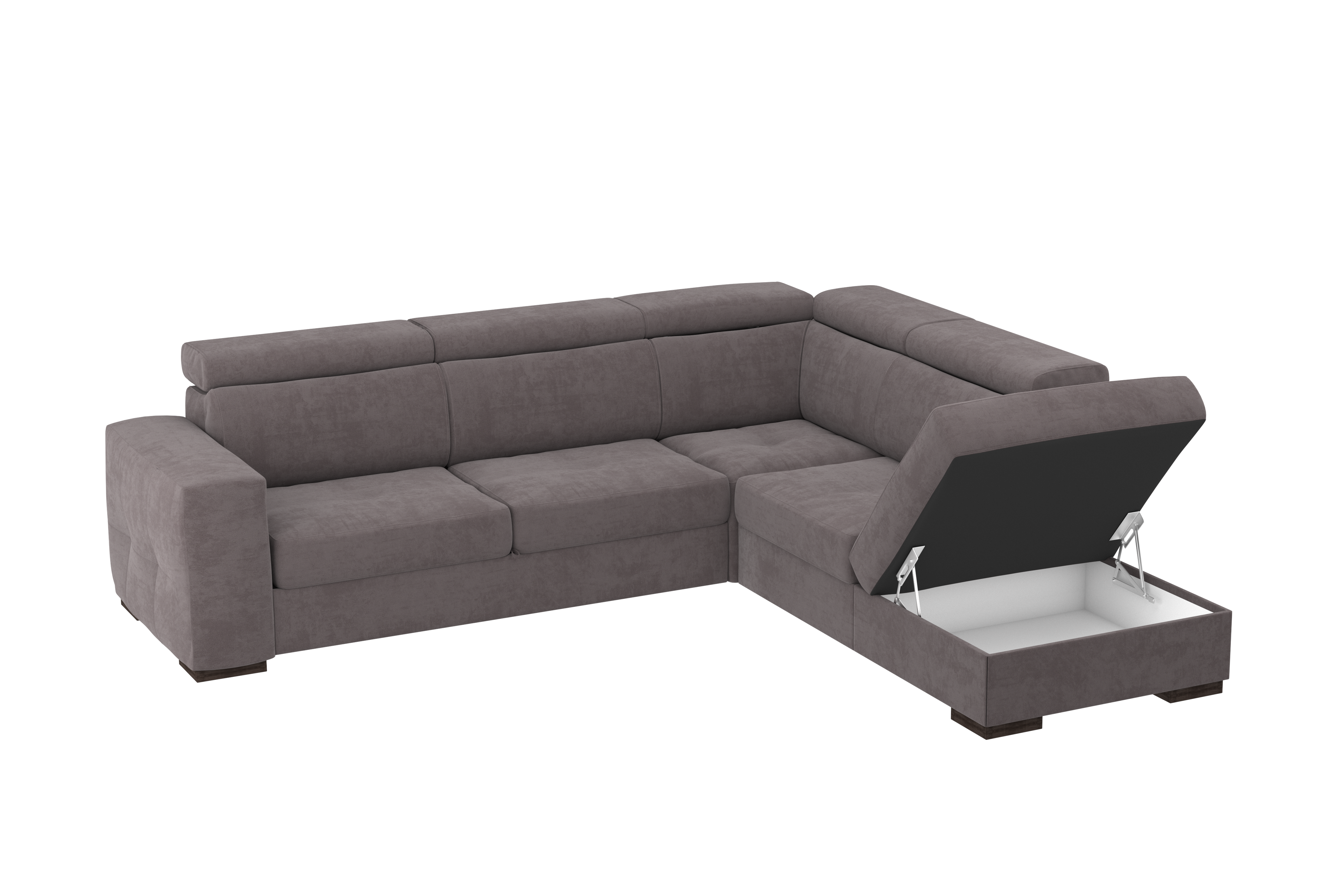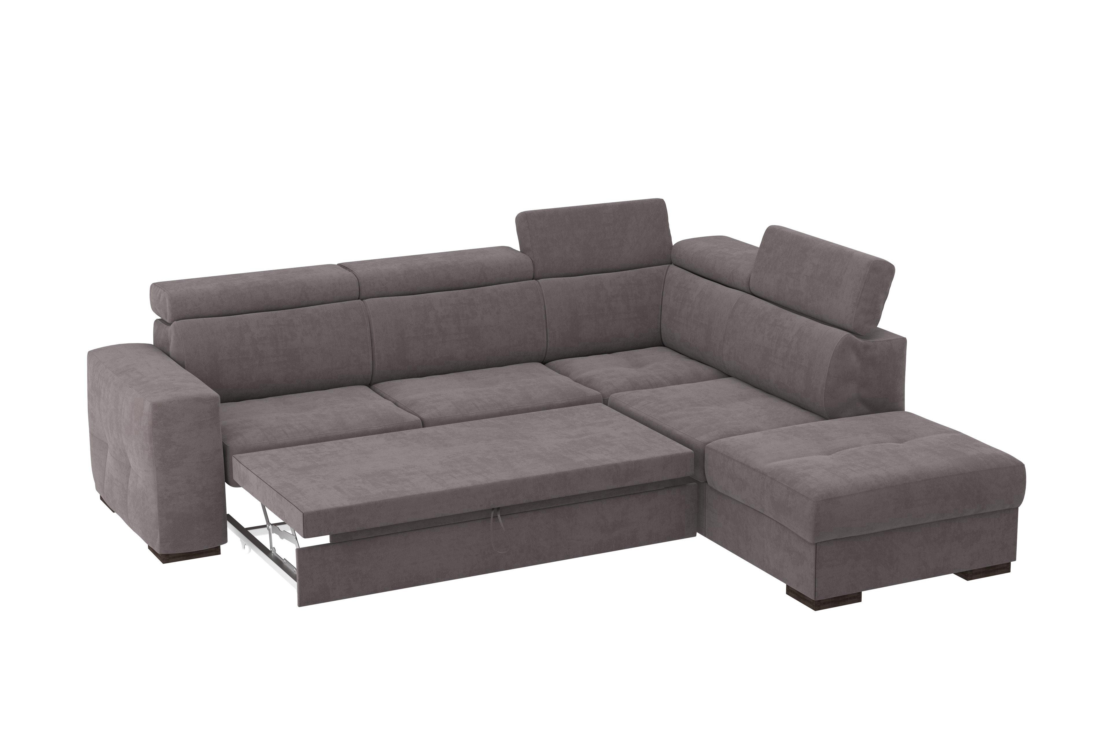 Un divano angolare dallo stile moderno, con un meccanismo inferiore scorrevole che consente di estrarre un ripiano che allineandosi alla seduta crea un comodo letto o un semplice supporto poggiapiedi. Il pouf terminale è un capiente contenitore dove riporre cuscini e quant’altro. Il divano è prodotto con tessuto di alta qualità resistente all’abrasione. Interamente prodotto in UE.