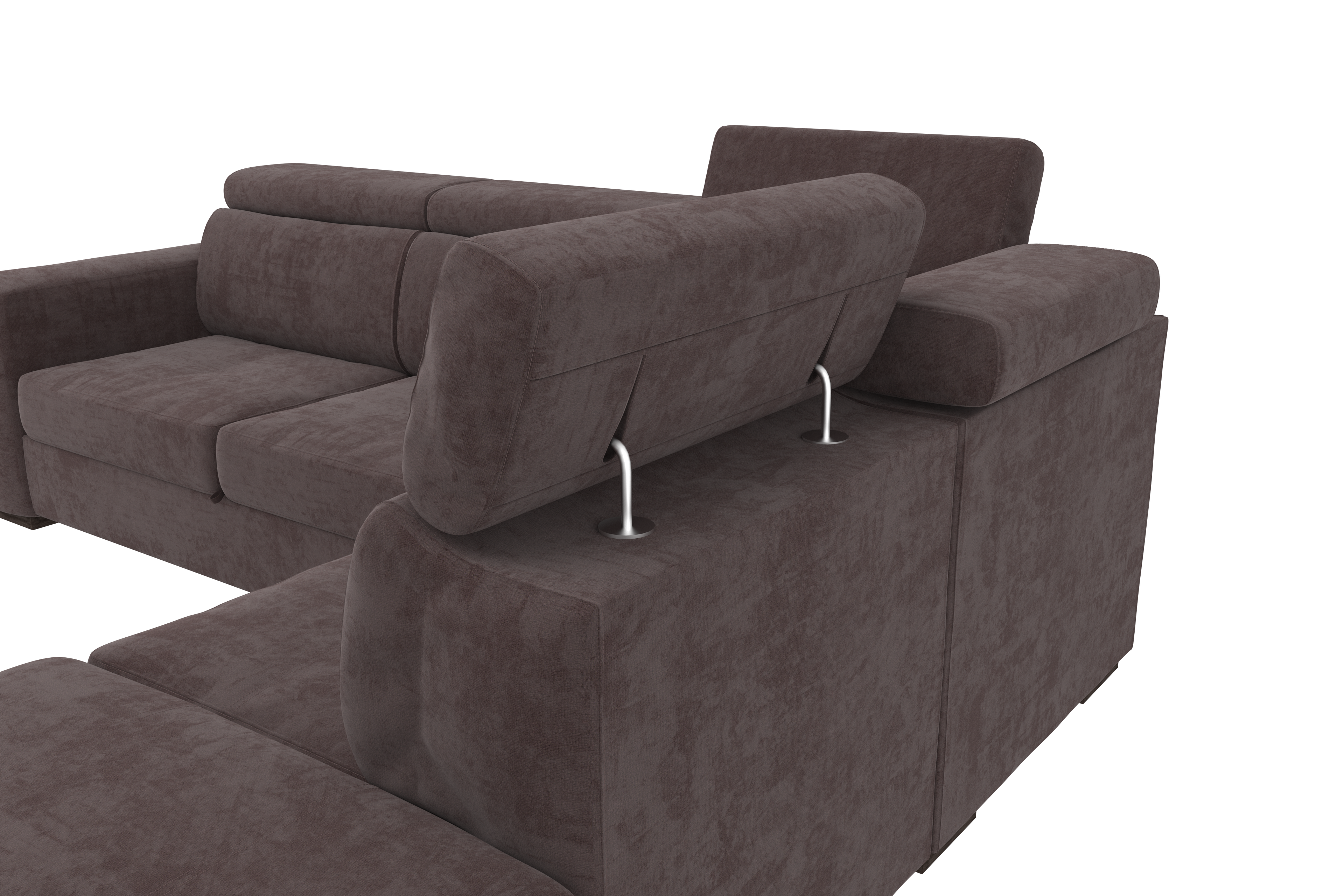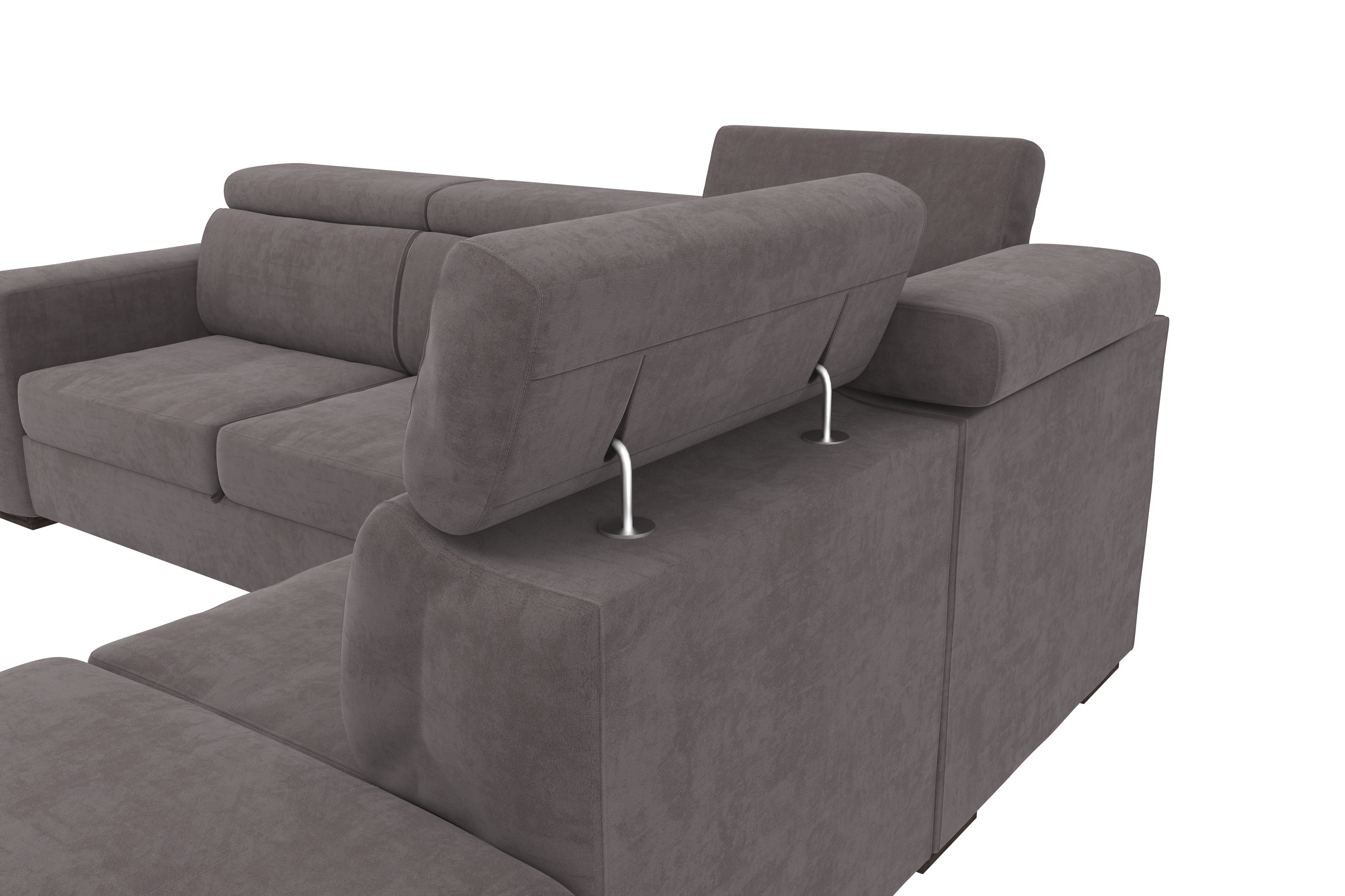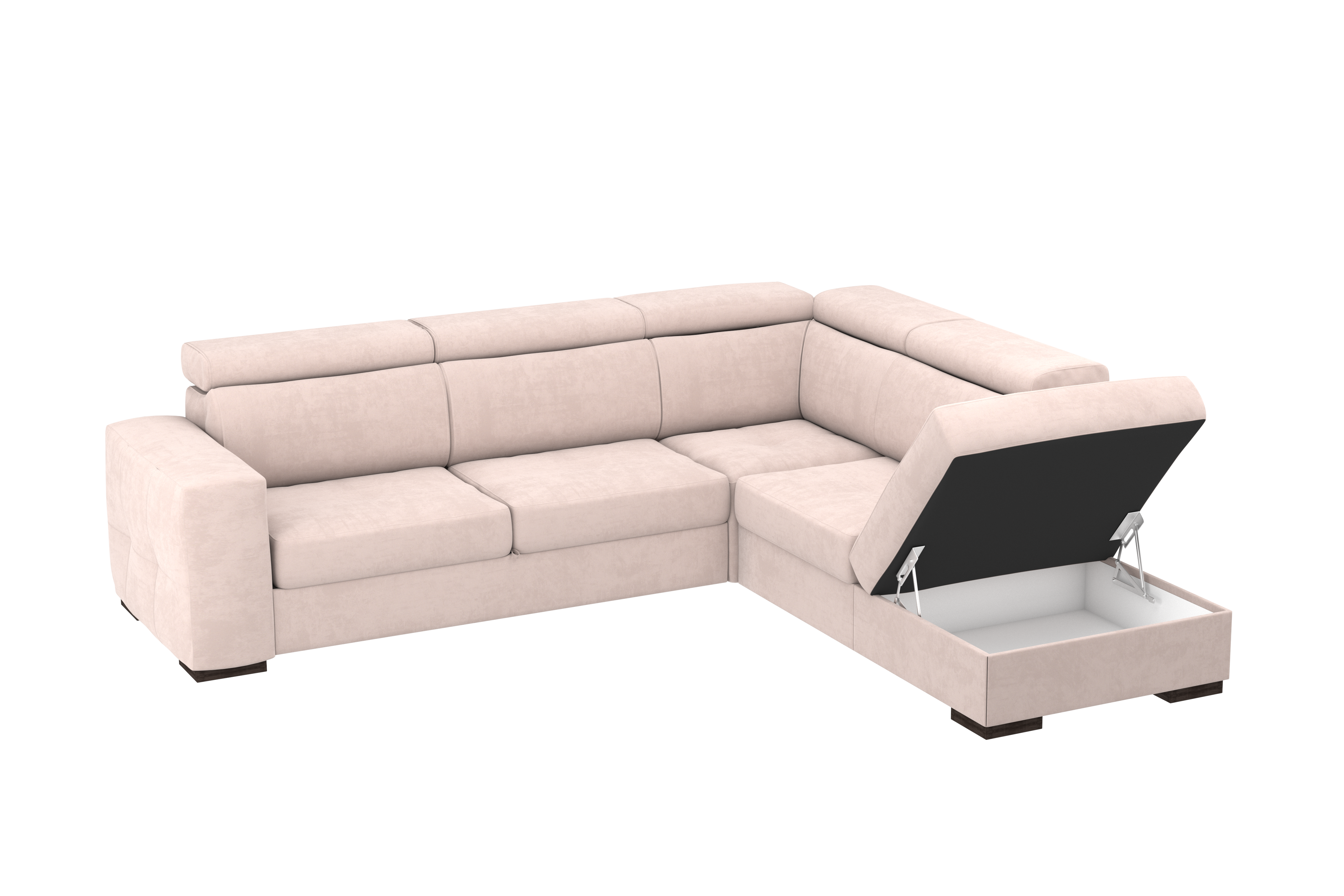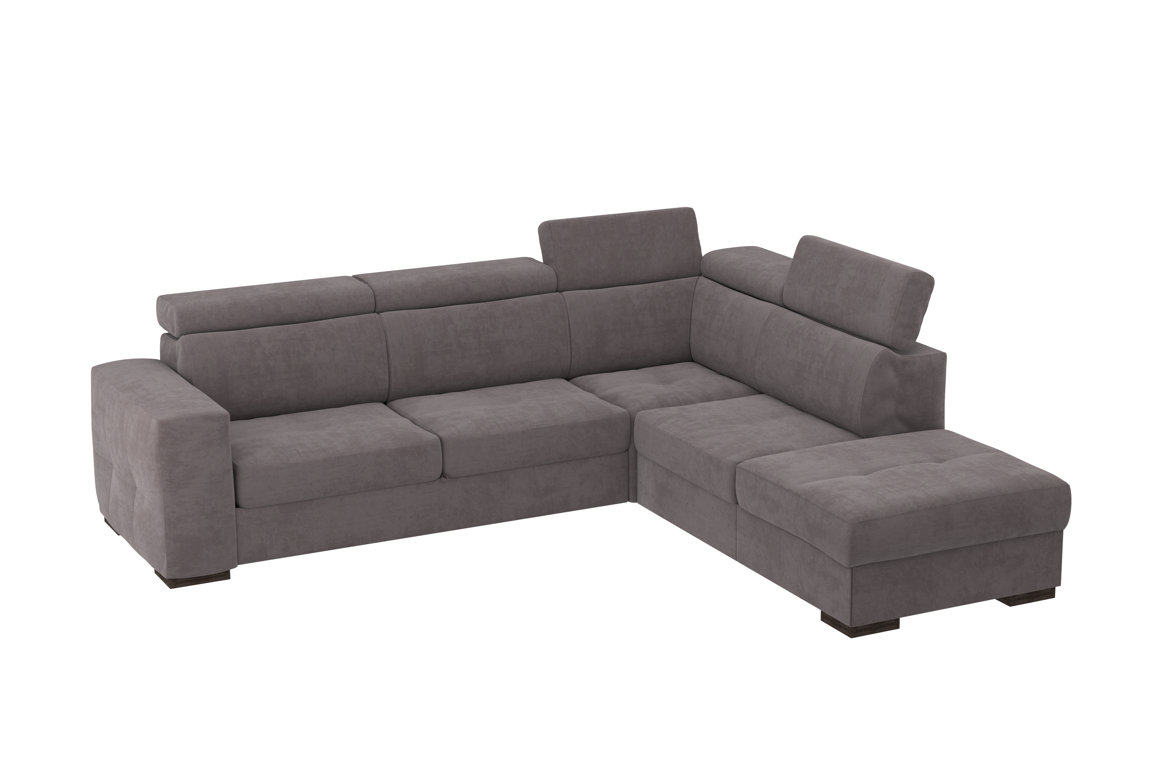 Un divano angolare dallo stile moderno, con un meccanismo inferiore scorrevole che consente di estrarre un ripiano che allineandosi alla seduta crea un comodo letto o un semplice supporto poggiapiedi. Il pouf terminale è un capiente contenitore dove riporre cuscini e quant’altro. Il divano è prodotto con tessuto di alta qualità resistente all’abrasione. Interamente prodotto in UE.