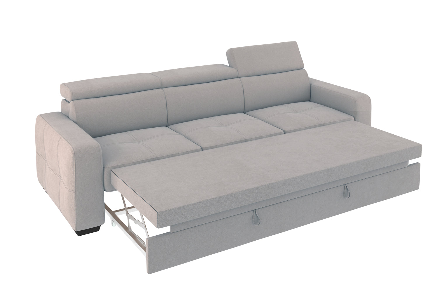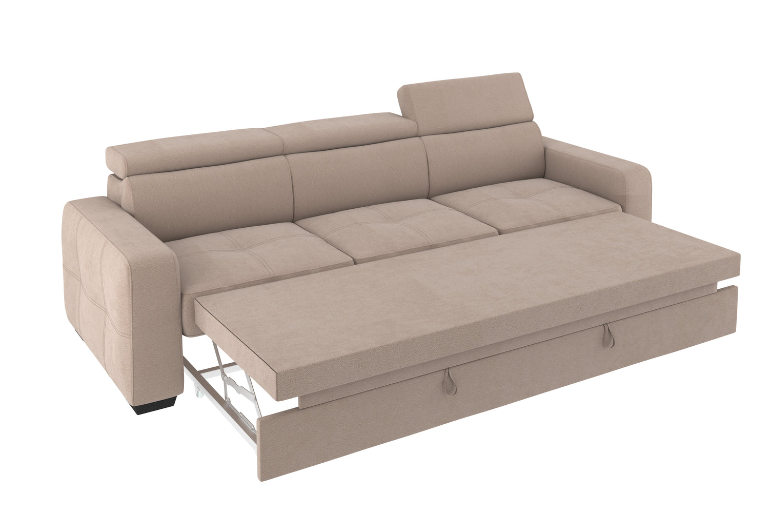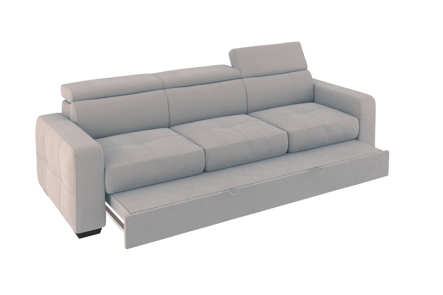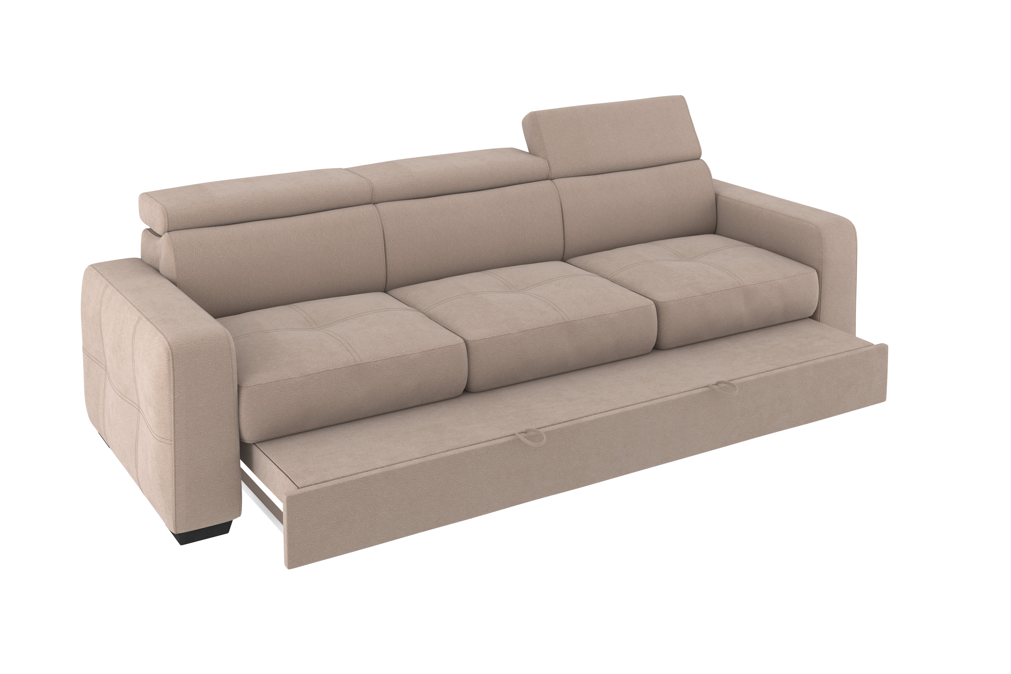 • Descrizione prodotto: questo divano letto a 3 posti è adatto a qualsiasi ambiente. È dotato di un grande pouf estraibile utile per distendere le gambe nei momenti di relax, oppure a trasformarsi insieme alle sedute in un letto rapido per ospiti dell'ultimo minuto. Le sue dimensioni massime d'ingombro sono 225x89cm e le sedute sono profonde ben 58cm.    area letto 190x125cm. È dotato di comodi poggiatesta regolabili in diverse posizioni fino a quella verticale